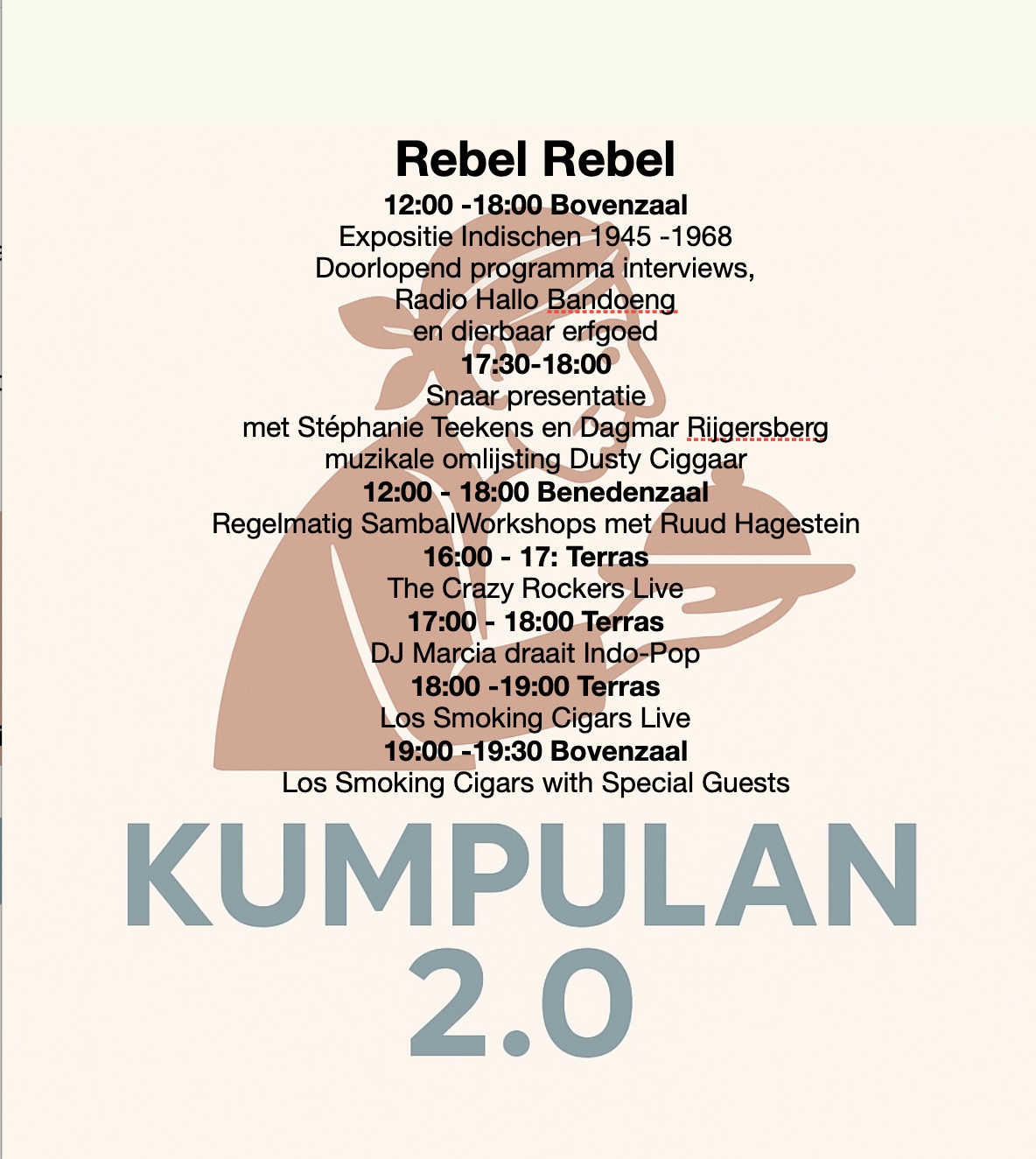 Er is muziek, maar ook is er veel te doen! Zo is een expositie, er is een workshop dans, een sambal workshop, een quiz en nog veel meer!